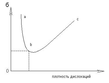 Если продолжить анализ кривой, то можно сделать вывод, что прочность можно повысить и другим способом, уменьшая плотность дислокаций, приготовляя образцы металлов в виде очень тонких нитей (толщина 2-10мм), так называемых усов, удалось поднять прочность в чистой меди, например, до 7*109н/м2, против реальной величины сопротивления сдвигу 105 н/м2.