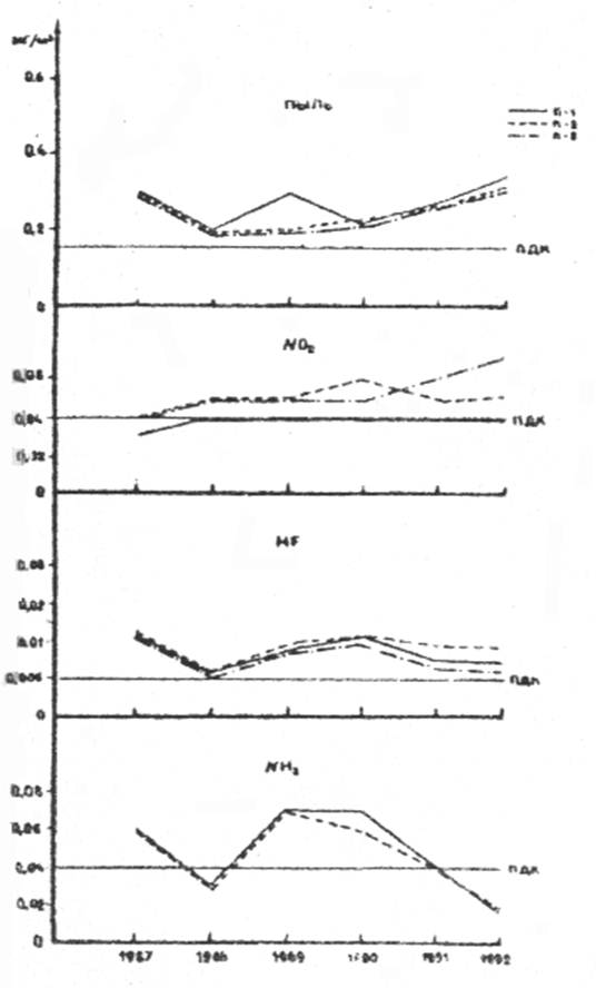 Концентрации аммиака также превышали ПДК. Средние значения его на посту 1 и 2 достигли 1,5 ПДК, на посту 3 в марте возросли почти в 2 раза. Наиболее высокое содержание отмечалось при штиле и слабом юго-восточном и южном ветрах (1 м/с), т.е. со стороны суперфосфатного завода.