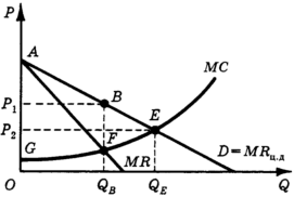 Модель совершенной ценовой дискриминации, осуществляемой фирмой-монополистом, показана на рис.1. Если монополия назначает единую цену для всего товарного рынка, то при оптимальной для нее цене Р1 объем производства устанавливается на уровне QB. Увеличивать производство дальше не имеет смысла: предельная выручка становится меньше предельных затрат (МС). При этом излишек потребителей равен площади треугольника Р1АВ. Совершенная ценовая дискриминация означает, что каждая единица товара продается по максимально возможной цене, равной цене спроса. Теперь с ростом продаж потери от снижения цен на все единицы товара отсутствуют, и кривая предельной выручки МДпд совпадает с кривой спроса (D). Монополисту становится выгодно увеличивать объем производства и продаж (за счет снижения цены на каждую последующую единицу товара) до тех пор, пока цена не опустится до величины P2, равной предельным затратам. Общий объем производства возрастает с QB до QE. Это столько же, сколько производилось бы в условиях совершенной конкуренции. Однако монополист перераспределяет в свою пользу весь излишек потребителя. Общая величина излишка становится равной площади фигуры, ограниченной осью ординат и кривыми МС и D (GAEF). В случае совершенной конкуренции при единой цене товарного рынка Р2 покупатели сохранили бы излишек, равный площади треугольника Р2AE.