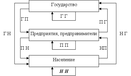 За каждой из указанной на схеме стрелок стоит множество разнообразных финансовых связей, потоков, отношений. Основываясь на общей схеме финансовых потоков между экономическими агентами, рассмотрим отдельные, наиболее представительные связи и финансовые отношения на разных уровнях. К ним относятся: “государство-предприятие” (ГП), “предприятие-государство” (ПГ), “государство-государство” (ГГ), “предприятие-население” (ПН), “население-государство” (НГ), “население-предприятие” (НП), “предприятие-предприятие” (ПП), “население-население” (НН), “государство-население” (ГН). Связь “государство-государство” характеризует перераспределение, переток денежных средств из одних каналов государственного бюджета в другие. Связь “предприятие-предприятие” отражает финансовые потоки между предприятиями, а связь “население-население” определяет движение денежных средств между отдельными группами населения.