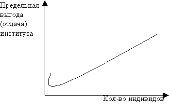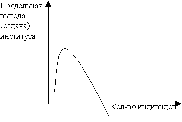 2. Также может наблюдаться преимущественно убывающая отдача от следования правилам и ограничениям того или иного института. Хотя для узкого круга лиц предельная отдача может наблюдаться положительной, при увеличении круга лиц, входящих в сферу действия этого института, предельная отдача непременно снижается. Примером здесь могут служить институты распределения экономических благ и льгот в командной экономике. Следование таким институтам невозможно без принуждения (по крайней мере, в довольно длительном периоде).
