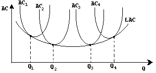 При возрастающей отдаче от масштаба производства пропорциональное увеличение всех затрат приводит к снижению средних издержек ( переход от кривой АС1 к АС2 ) . При убывающей отдаче от масштаба , когда объемы производства слишком велики , пропорциональное увеличение всех затрат приводит к повышению средних издержек (переход от кривой АС3 к АС4 ). Многие отрасли характеризуются постоянной отдачей от масштаба в широких пределах изменения объема выпуска . В этом случае минимальные средние издержки при разных размерах фирмы одинаковы . U-образная линия LAC , огибающая все возможные краткосрочные кривые средних издержек , представляет собой долгосрочную кривую средних издержек : ее нисходящий участок соответствует возрастающей отдаче от масштаба , а восходящий участок – убывающей отдаче от масштаба . При изменении своего размера фирма каждый раз «переходит» на новую краткосрочную кривую АС и в то же время движется вдоль долгосрочной кривой LAC . Таким образом , изменяя величину всех вовлекаемых в производство ресурсов , фирма стремится оптимизировать свой размер и минимизировать долгосрочные средние издержки .