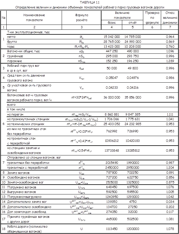 На основе данных задания по вариантам (VI – базисный месяц, III – отчётный) была заполнена ТАБЛИЦА 1.1 «Объёмные показатели рабочего парка грузовых вагонов дороги». Формулы, по которым производились расчёты, приведены в графе 2 данной таблицы. Относительные величины динамики (графа 7) определяются отношением величины показателя за отчётный период к величине показателя за базисный период.