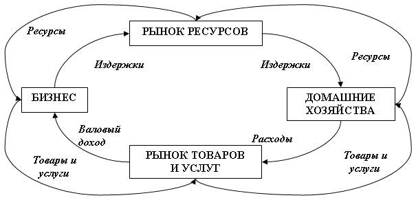 С рынка ресурсов ресурсы направляются в бизнес. Бизнес за ресурсы обязан расплачиваться и все расчет за ресурсы представляют для бизнеса издержки. Бизнес – любое лицо (Юридическое или Физическое), производящее товары и услуги. Созданные бизнесом товары и услуги отправляются на рынок, откуда идут в домашние хозяйства. Домашние хозяйства несут расходы на товары и услуги, которые для бизнеса представляют валовый доход.