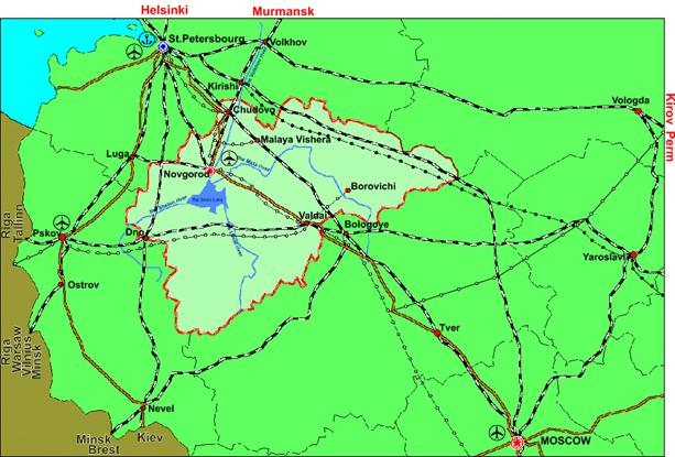 Данная карта наглядно изображает главные автомобильные магистрали, железнодорожные дороги, а также другие средства связи. Проанализировав карту можно сделать вывод, что Новгородская область находится в выгодном положении по отношению к транспортным путям, а также имеет связь со многими городами, включая города России и ближнего зарубежья.