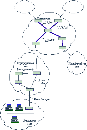 Глобальная сеть, объединяющая отдельные локальные сети, разбросанные по большой территории, также имеет, как правило, иерархическую структуру с высокоскоростной магистралью (например, АТМ), более медленными периферийными сетями (например, framerelay) и каналами доступа локальных сетей к глобальным. Эти составляющие глобальной сети представлены на рисунке 1.3.