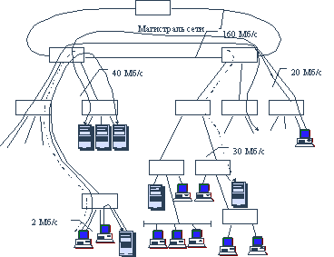 Более совершенная схема построения локальной сети должна опираться не на две доступные скорости, а на более дробную иерархическую линейку скоростей для компьютеров сети. Тогда можно будет более точно и с меньшими затратами учесть потребности каждой группы компьютеров, объединенных в сегмент, или даже каждого отдельного компьютера. Для согласования скоростей работы каналов между сегментами сети необходимо применять устройства, обрабатывающие трафик с буферизацией пакетов - коммутаторы или маршрутизаторы, но не концентраторы, которые организуют побитную передачу данных из сегмента в сегмент.