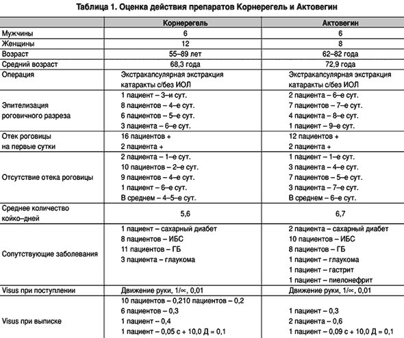 В данном исследовании Корнерегель получали 18 пациентов, а Актовегин – 14 пациентов. Критерием клинической эффективности лечения являлось исчезновение отека роговицы, улучшение зрения, эпителизация роговичного разреза. Также учитывались и другие критерии: выраженность и продолжительность роговичного синдрома, воспалительных изменений в глазу (отек век, инъекция конъюнктивы).