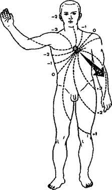 Рисунок 7. Электрическое поле единого сердечного диполя через 0,04 с после начала возбуждения желудочков.