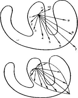 Как видно в процессе возбуждения сердечной мышцы вектор единого сердечного диполя постоянно меняет свою величину и ориентацию, причем любому моменту распространения возбуждения по сердцу соответствует свой суммарный моментный вектор (1,2,..,8). Соединив стрелки последовательных моментных векторов, получим так называемую векторную петлю, очень наглядно графически отображающую ход возбуждения в сердечной мышце. Если теперь, согласно известному правилу, суммировать все отдельные моментные векторы, получим один средний результирующий вектор ЭДС сердца, отражающий среднее направление и величину ЭДС сердца в течение всего периода деполяризации желудочков. Эти понятия — моментный вектор и средний результирующий вектор ЭДС сердца — имеют большое практическое значение при описании различных изменений ЭКГ, в чем Вы сами вскоре сможете убедиться. Средний результирующий вектор деполяризации желудочков обозначается AQRs,. деполяризации предсердий - АР, а реполяризации желудочков - AT.