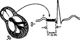 Из предсердий электрический импульс направляется в АВ-узел, где происходит медленное распространение волны возбуждения. Затем возбуждается пучок Гиса, ножки и ветви пучка Гиса и волокна Пуркинье. Величина разности потенциалов, возникающая в этот период в сердце, очень мала, так как возбуждается только атриовентрикулярная проводящая система. Поэтому на ЭКГ записывается изоэлектрический сегмент Р—Q(R).