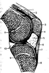 tibiae; 9 - tibia; 10 - meniscus lateralis; 11 - femur.