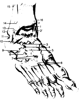 1 - tibia; 2 - lig. mediale (deltoideum); 3 - lig. calcaneonaviculare; 4 - lig. calcaneocuboideum; 5 - ligg. cuneonavicularia dorsalia; 6 - ligg. metatarsalia interossea; 7 - ligg. tarsometatarsalia dorsalis; 8 - lig. cuneocuboideum dorsale; 9 - lig. calcaneocuboideum dorsale; 10 -lig. talocalcaneum laterale; 11 - lig. calcaneofibulare; 12 - malleolus lateralis; 13 - lig. talofibulare anterius; 14 - lig. tibiofibulare anterius; 15 - membrana interossea cruris; 16 - malleolus mediales.