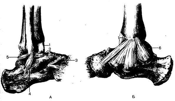 Связки, укрепляющие сустав, располагаются на боковых поверхностях сустава. Медиальная (дельтовидная) "связка, lig. mediale (deltoideum) (см. рис. 15, 16), располагаясь на медиальной поверхности сустава, имеет форму расходящейся книзу широкой фиброзной пластинки. Эта толстая и прочная связка начинается на медиальной лодыжке, спускается вниз и прикрепляется своим расширенным концом к ладьевидной, таранной и пяточной костям. В ней выделяются четыре части: большеберцово-ладьевидная часть, pars tibionavicularis, большеберцово-пяточная часть, pars tibiocalcanea; передняя и задняя большеберцово-таранная части, partes tibiotalares anterior et posterior. С латеральной стороны сустава капсула укреплена тремя связками. Передняя таранно-малоберцовая связка, lig. talofibulare anterius, тонкая, короткая, имеет форму четырехугольника. Она проходит почти горизонтально, прикрепляется к наружной поверхности латеральной лодыжки и к шейке таранной кости. Задняя таранно-малоберцовая связка, lig. talofibulare posterius, расположена на заднелатеральной поверхности сустава.