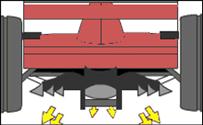 На самом деле принцип действия диффузора прямопротивоположен принципу действия антикрыла: вместо того, чтобы отталкивать воздух, диффузор засасывает его. Эффект этот получается из-за аэродинамической формы. Диффузор находится в самой нижней, "хвостовой" части болида, прямо под задним антикрылом, и объем диффузора увеличивается по мере приближения его к "концу" болида (см. верхний Рис. 2.10). Воздух, попадающий в диффузор из-под дна болида разрежается, за счет попадания его в увеличенный объем диффузора, отсюда и эффект засасывания. Диффузор состоит из большого количества всеразличных "тонельчиков" и "разделителей", которые аккуратно и очень точно контролируют потоки воздуха для лучшего засасывания. Так как диффузор находится в зоне выхлопных газов и заднего рычага подвески, то это накладывает жесткие требования на его конструкцию, в противном случае (при некорректном создании и регулировках диффузора) при изменении скорости выхлопные газы будут влиять на аэродинамический баланс болида.