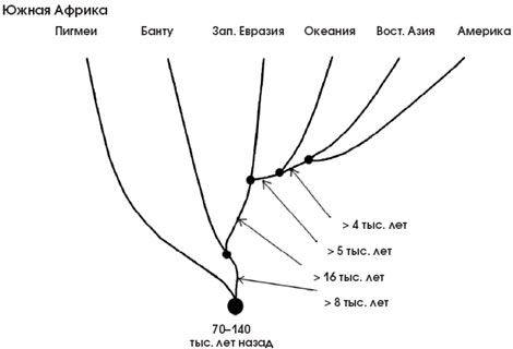 Изучая разнообразие ДНК современных народов, можно оценить численность той прапопуляции, от которой, согласно гипотезе африканского происхождения, произошло всё человечество. Она была невелика — порядка нескольких тысяч. Сопоставляя ДНК-маркёры аборигенов Южной Африки, можно сказать, что примерно 70–150 тыс. лет назад началась интенсивная дифференциация и сложные демографические процессы, сопровождающиеся возникновением разнообразных популяций в пределах Африки. Затем, 50–100 тыс. лет назад, волны переселенцев стали выплёскиваться за пределы Африки и растекаться по другим континентам, что отразилось на своеобразной структуре ДНК-древа (рис. 6).