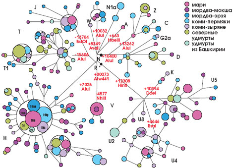 Рис. 8. Сеть мтДНК народов Волго-Уральского региона. Цветом обозначены различные этнические группы, тёмными буквами — разные типы мтДНК, размер кружка — число индивидов с данным типом мтДНК, красными цифрами — мутации. Видно значительное перекрывание изменчивости: в различных этнических группах встречаются одинаковые типы мтДНК, в т. ч. европеоидные, напр. Н., и монголоидные, напр. U. (из: Бермишева и др., 2002). |