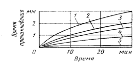 С увеличением времени выдержки глубина проникновения на всех материалах. кроме корунда, возрастала; в корундовые смеси глубина проникновения в течение 30 мин была минимальной. Наибольшая глубина проникновения наблюдалась в смесь на кварцевом песке.