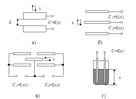 На рис. 3 схематично изображены различные типы емкостных преобразователей.
