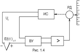 Рассмотрим принцип работы автоматических потенциометров, получивших большое распространение в различных отраслях промышленности, компенсирующее напряжение регулируется не вручную, а автоматически, с помощью реверсивного двигателя. Упрощенная схема автоматического потенциометра представлена на рис 1.4.