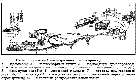 В состав магистральных нефтепроводов входят: линейные сооружения, головные и промежуточные перекачивающие и наливные насосные станции и резервуарные парки (рис. 20.1). В свою очередь линейные сооружения согласно СНиП 2.05.06 — 85 включают: трубопровод (от места выхода с промысла подготовленной к дальнему транспорту товарной нефти) с ответвлениями и лупингами, запорной арматурой, переходами через естественные и искусственные препятствия, узлами подключения нефтеперекачивающих станций, узлами пуска и приема очистных устройств и разделителей при последовательной перекачке, установки электрохимической защиты трубопроводов от коррозии, линии и сооружения технологической связи, средства телемеханики трубопровода, линии электропередачи, предназначенные для обслуживания трубопроводов, и устройства электроснабжения и дистанционного управления запорной арматурой и установками электрохимической защиты трубопроводов; противопожарные средства, противоэррозионные и защитные сооружения трубопровода; емкости для хранения и разгазирования конденсата, земляные амбары для аварийного выпуска нефти, здания и сооружения линейной службы эксплуатации трубопроводов; постоянные дороги и вертолетные площадки, расположенные вдоль трассы трубопровода, и подъезды к ним, опознавательные и сигнальные знаки местонахождения трубопровода; пункты подогрева нефти указатели и предупредительные знаки.