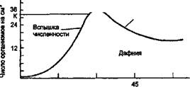 Логарифмическая фаза — это такая фаза, когда бактерии растут с максимальной скоростью. Число клеток увеличивается почти экспоненциально, а кривая роста идет прямолинейно. Затем рост колоний начинает замедляться, и культура входит в стационарную фазу, а затем и в фазу замедления роста. Кривая роста приобретает сигмоидную (S-образную) форму. Такой тип роста называют зависимым от плотности популяции, которая влияет на истощение пищевых ресурсов и накопление токсических продуктов, а потому нарост. С увеличением плотности скорость роста популяции постепенно снижается до нуля, кривая выходит на плато. При нулевом росте популяция стабильна, т. е. размеры ее не меняются. Отдельные организмы при этом могут расти и размножаться. Нулевая скорость роста означает лишь то, что скорость размножения, если оно происходит, уравновешена смертностью. Такая сигмоидная кривая роста получена для ряда одноклеточных и многоклеточных организмов, например, для клеток водорослей в культуральной жидкости, для фитопланктона озер и океанов весной, для насекомых (мучные хрущаки, а также клещи, интродуцированные в новое местообитание с обильными запасами пищи, где нет хищников). Когда экспоненциальный рост продолжается вплоть до внезапного падения плотности популяции в результате исчерпания ресурсов среды, получается кривая другого типа, называемой «J-образной», или кривой «бум и крах». Такой рост не зависит от плотности, так как его регуляция связана с плотностью популяции до самого момента катастрофы. Крах может происходить по тем же причинам, например, из-за истощения пищевых ресурсов, которое в случае сигмоидной кривой роста заблаговременно оказывало регулирующее влияние на рост. Миграция, или расселение, так же как и внезапное снижение скорости размножения, может способствовать уменьшению численности популяции. Расселение может быть связано с определенной стадией жизненного цикла, например, с образованием семян. Примеры того и другого типа показаны на рис. 6. Для обоих типов характерна экспоненциальная фаза в начале роста. Рассматривая вопрос об оптимальных размерах популяции в данной среде, следует учитывать поддерживающую емкость или кормовую продуктивность среды. Чем выше поддерживающая емкость, тем больше максимальный размер популяции, который может существовать неопределенно долгое время в данном местообитании. Дальнейшему росту популяции будут препятствовать один или несколько лимитирующих факторов. Это зависит от доступности ресурсов для данного вида. В случае J-образной кривой роста (рис. 6) популяция внезапно выходит за пределы поддерживающей емкости среды. Эту величину обозначают символом К, который можно использовать также для обозначения максимальных размеров стабильной популяции в данных условиях. Рост, соответствующий сигмоидной и .J-образной кривой, можно описать алгебраически с помощью простых дифференциальных уравнений. Оба уравнения относятся к популяциям, в которых поколения полностью перекрываются, так что популяция изменяется непрерывно. Это и позволяет использовать дифференциальные уравнения (таб.3).